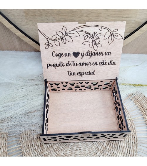 Viene con una cajita de madera personalizada y los corazones en el interior.