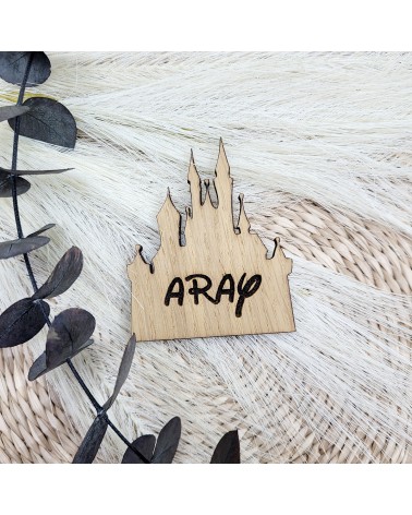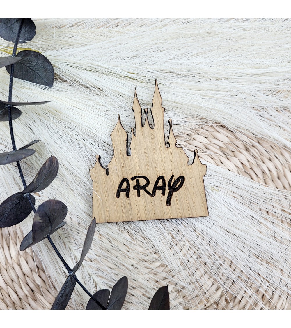 Convierte tu celebración en un cuento de hadas con este marcasitio en madera rechapado roble, grabado con el diseño del icónico castillo Disney y personalizado con el nombre de tu invitado en el centro.