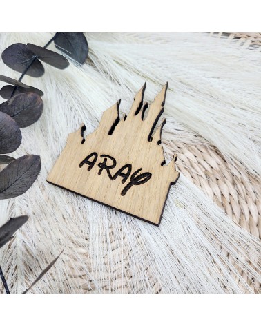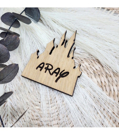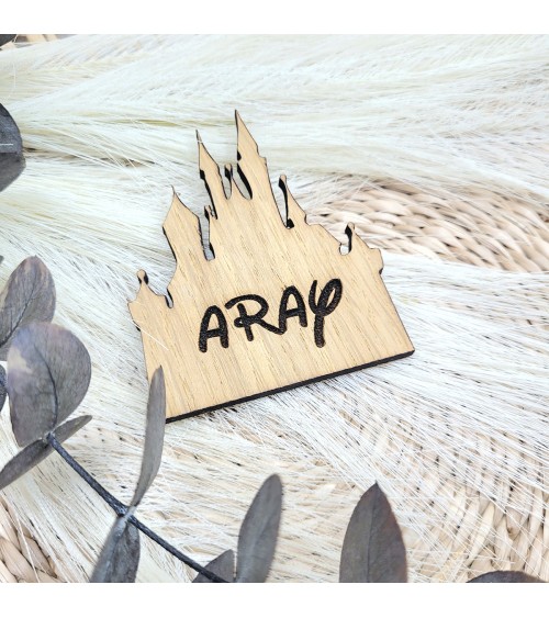 Su forma de castillo y el acabado cálido del roble aportan elegancia y originalidad a cada mesa, mientras que el diseño grabado con láser asegura precisión y durabilidad. Es el detalle perfecto para bodas temáticas, comuniones, bautizos o cumpleaños infantiles con un toque mágico.