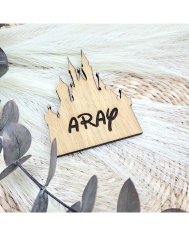 Convierte tu celebración en un cuento de hadas con este marcasitio en madera rechapado roble, grabado con el diseño del icónico castillo Disney y personalizado con el nombre de tu invitado en el centro.