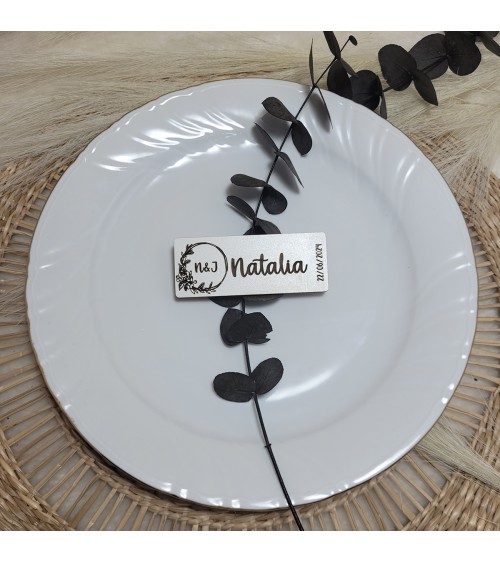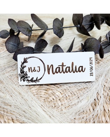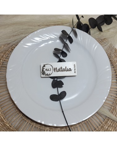 Marcasitio rectangular en madera DM pintada de blanco, una pieza artesanal perfecta para darle un toque elegante y personalizado a tus eventos especiales. Cada marcasitio cuenta con un grabado en el centro con el nombre que elijas, acompañado de un delicado círculo con una flor grabada a un lado, que aporta un detalle único y sofisticado.