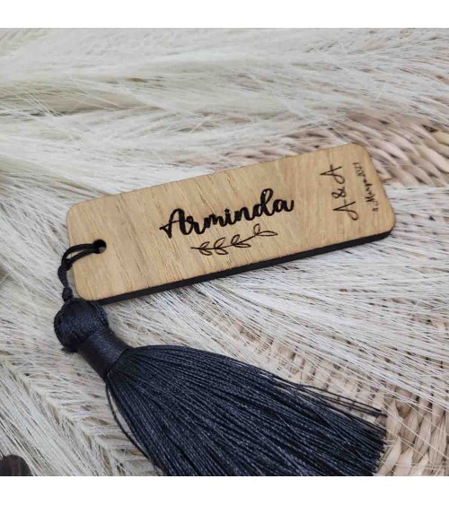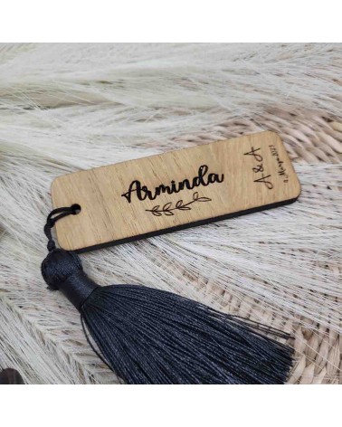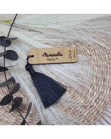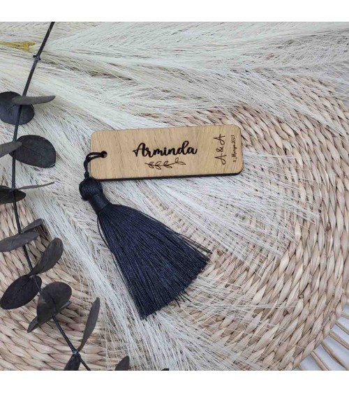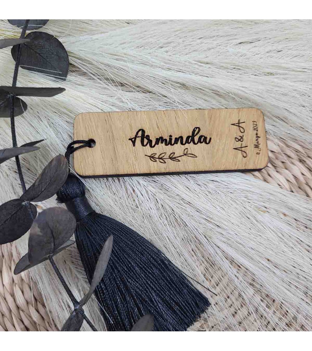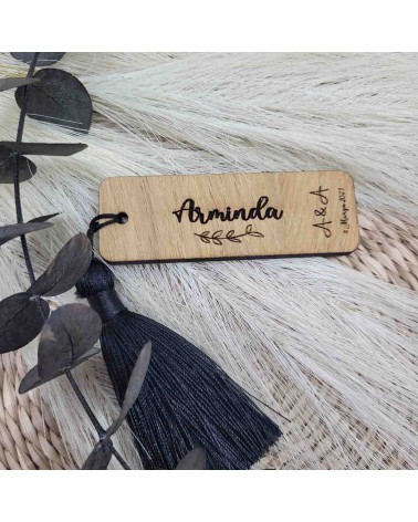Marcasitio personalizado de madera con nombre grabado y pompon de fleco