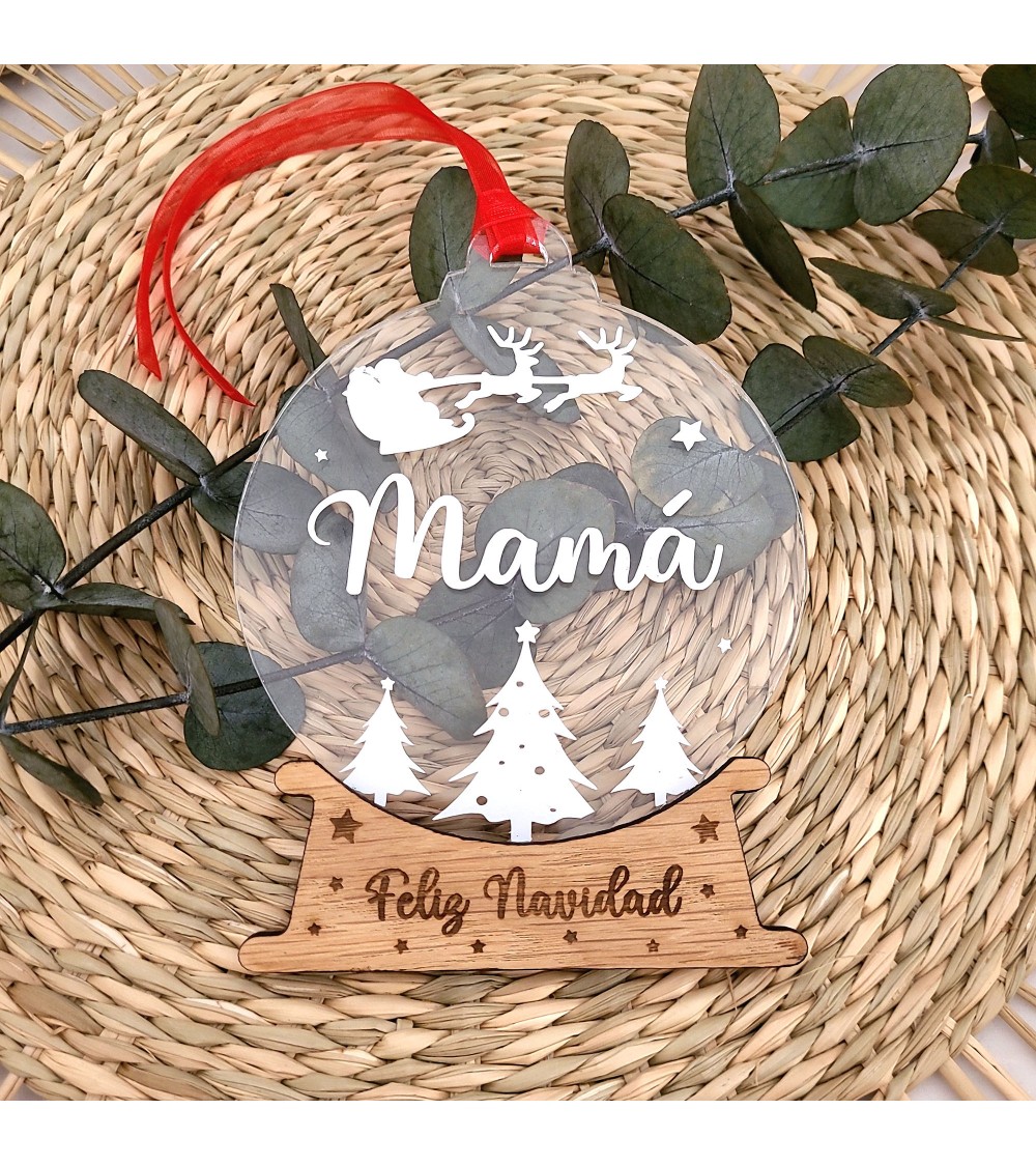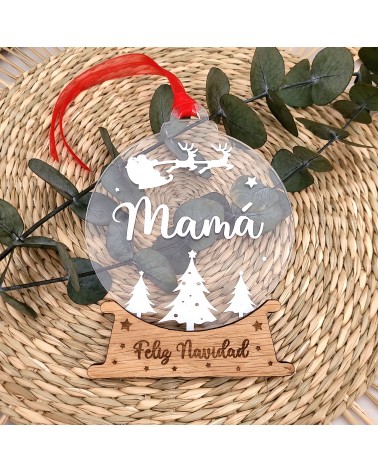 No olvide guardar su personalización para poder añadirla al carritoBola de Navidad diseño bola de nieve, realizada con metacrilato transparente, madera de roble y vinilio blanco.
