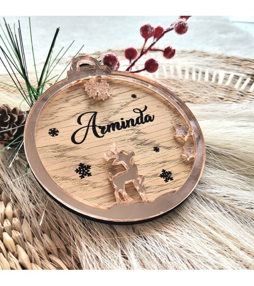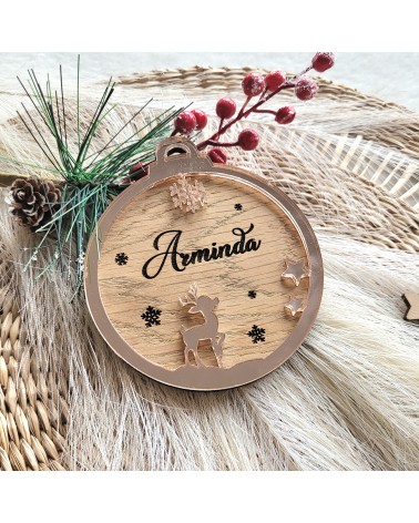 Celebra la Navidad con un adorno que combina lo artesanal con el brillo moderno. Esta bola de 10 cm está elaborada en madera rechapada de roble, con el nombre grabado en el centro y rodeada por un aro exterior en metacrilato espejo rosa. El diseño incluye una estrella decorativa y un reno en metacrilato, que aportan un toque festivo y elegante. Ideal para regalar o decorar con estilo y personalidad.