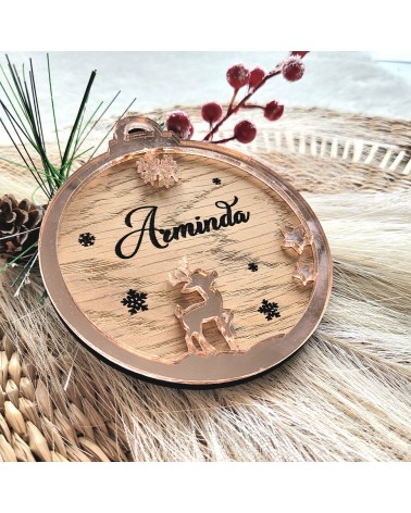 No olvide guardar su personalización para poder añadirla al carritoCelebra la Navidad con un adorno que combina lo artesanal con el brillo moderno. Esta bola de 10 cm está elaborada en madera rechapada de roble, con el nombre grabado en el centro y rodeada por un aro exterior en metacrilato espejo rosa. El diseño incluye una estrella decorativa y un reno en metacrilato, que aportan un toque festivo y elegante. Ideal para regalar o decorar con estilo y personalidad.