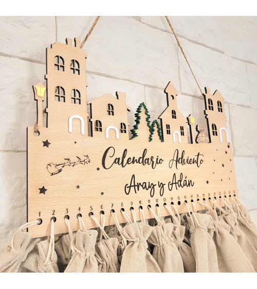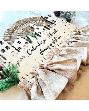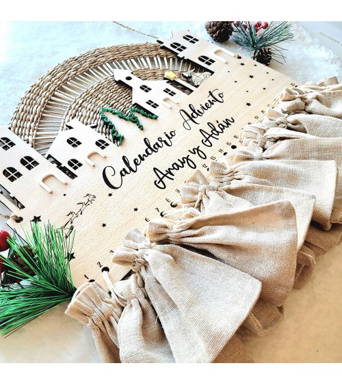 Vive la ilusión de la Navidad cada día con nuestro calendario de adviento artesanal, realizado en madera de haya de 4 mm, grabado con detalle mediante corte láser y acompañado de bolsitas para que puedas añadir un pequeño detalle diario: chuches, mensajes, juguetes, chocolates o actividades familiares.