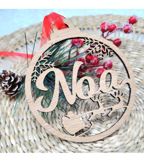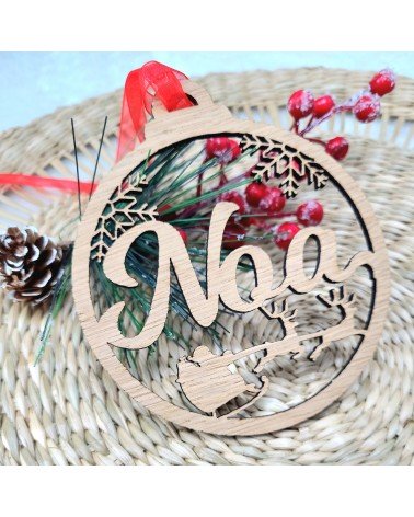 Puedes elegir el nombre o la palabra que quieras poner en la bola, así como el tipo de madera a utilizar y el color de la cinta para colgarla.
