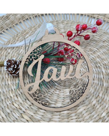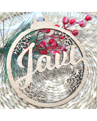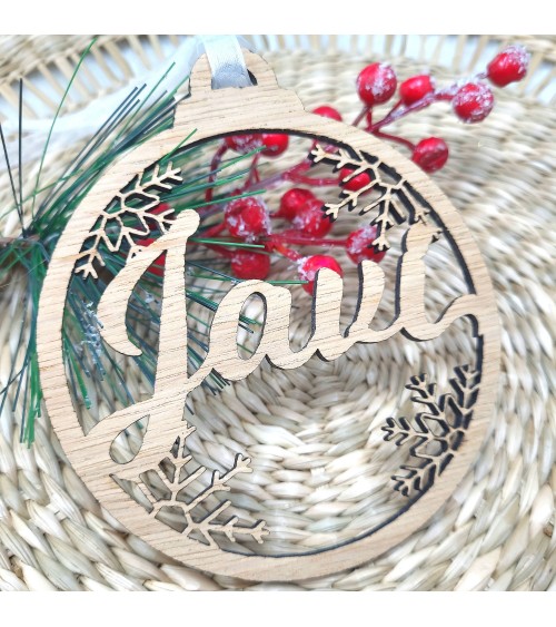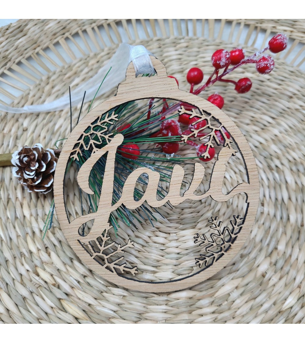 Dale un toque personal y acogedor a tu árbol de Navidad con esta bola de navidad, realizada en madera rechapada de roble. En el centro figura el nombre calado en elegante tipografía cursiva, rodeado de delicados copos de nieve grabados que aportan un aire festivo y artesanal. Su diseño cálido y natural la convierte en el detalle perfecto para regalar o decorar con significado.