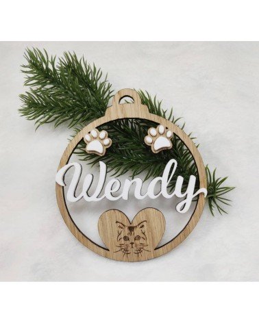 Celebra la Navidad con tu compañero felino con esta bola de 10 cm elaborada en madera rechapada de roble. En el centro, el nombre de tu mascota destaca en metacrilato blanco, aportando un contraste elegante y moderno. El diseño incluye dos huellas decorativas en la parte superior y un rostro de gato grabado en forma de corazón en la parte inferior, creando un adorno lleno de ternura y personalidad.