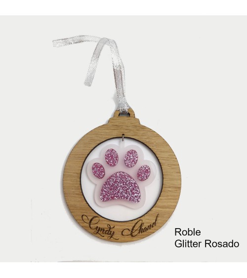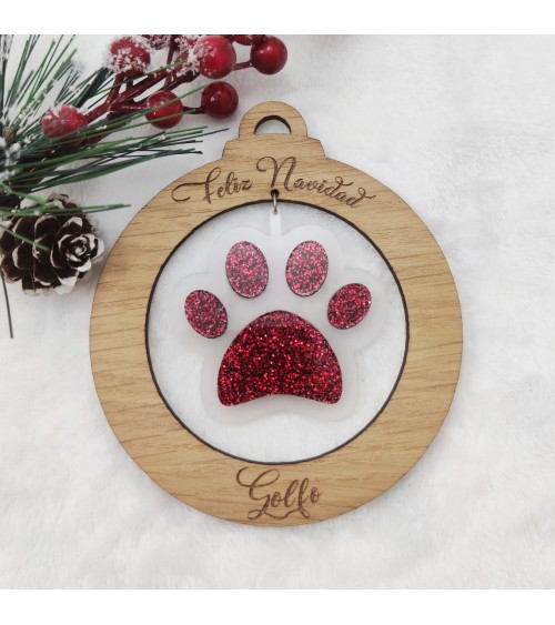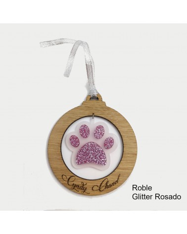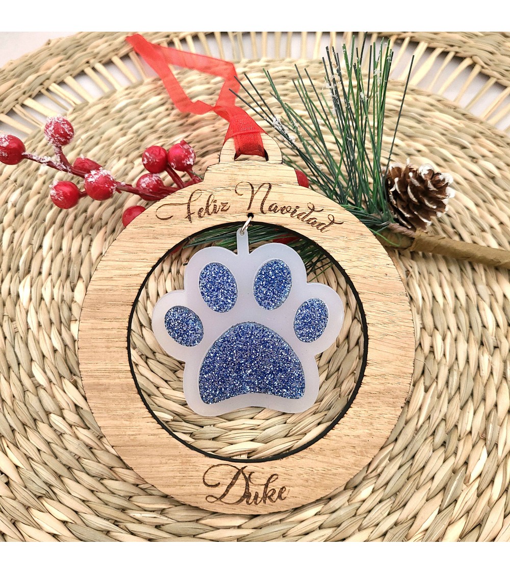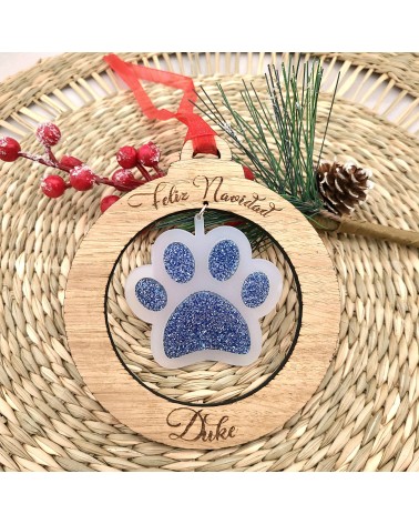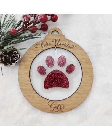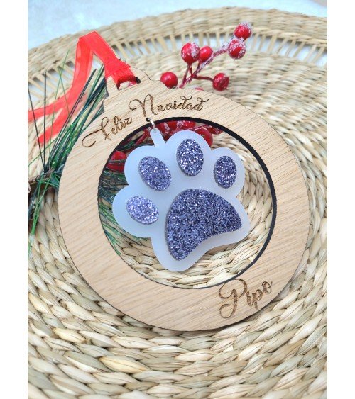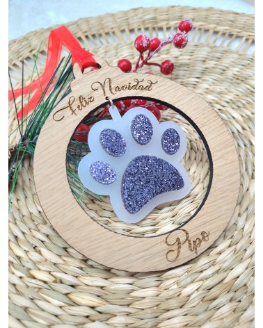 Bola de Navidad diseño Huella de Perro realizada en madera de haya o roble y metacrilato glitter.