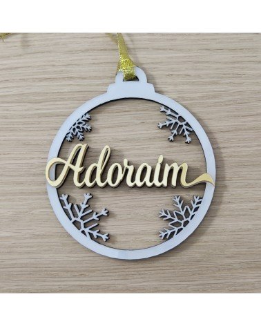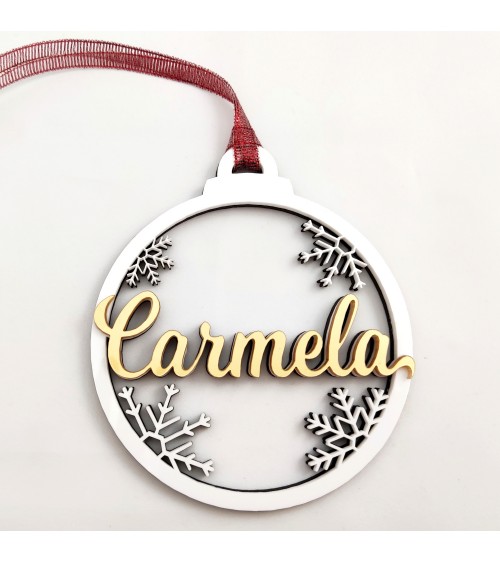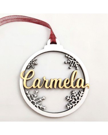 No olvide guardar su personalización para poder añadirla al carritoBola de Navidad diseño Copos de Nieve realizada en metacrilato blanco y dorado con base en dm.