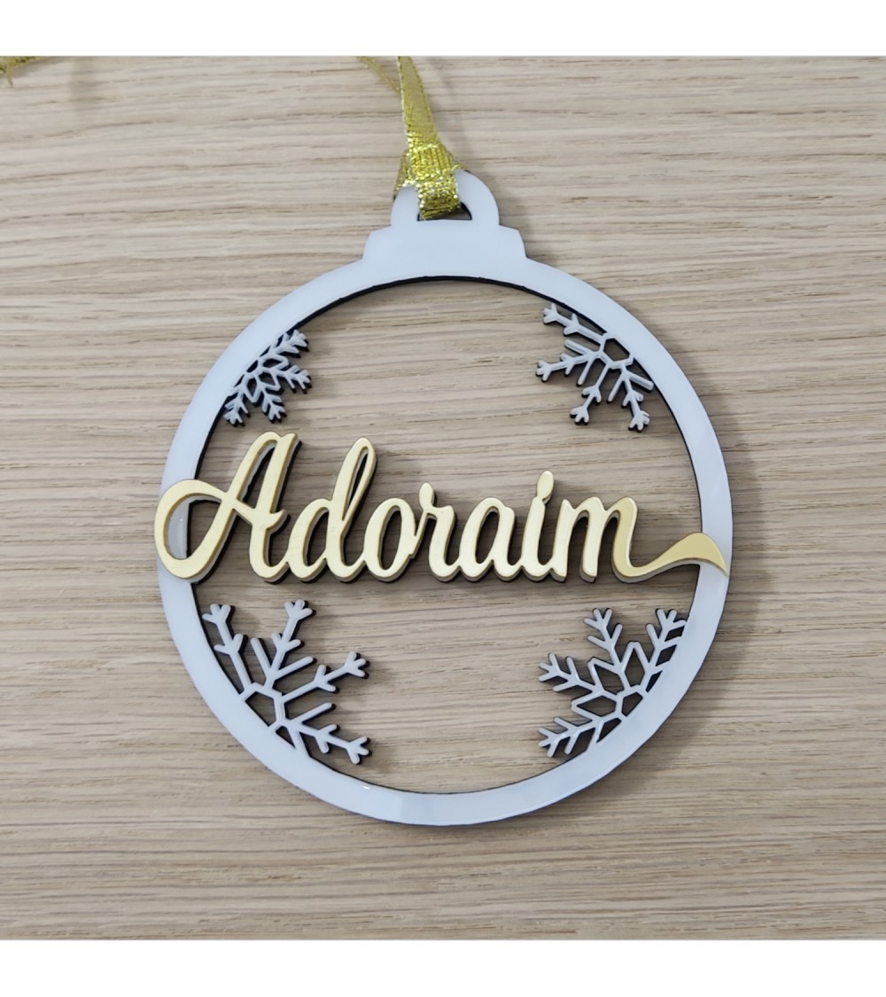Material de la bola: Base en dm de 3mm, segunda capa en metacrilato blanco de 3mm y nombre en metacrilato dorado de 3mm..
