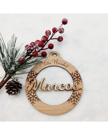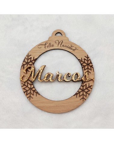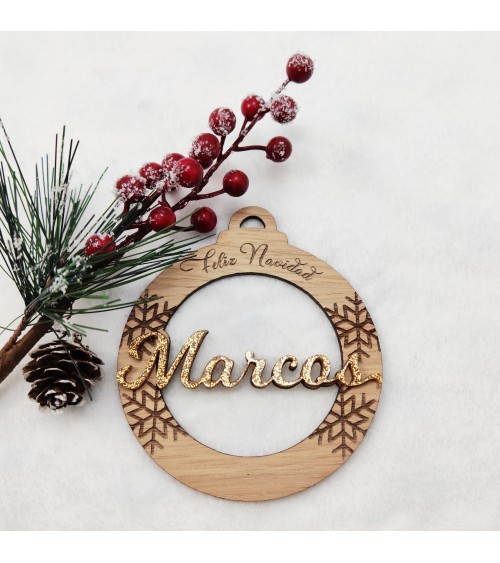 No olvide guardar su personalización para poder añadirla al carritoBola de Navidad diseño Copo de Nieve Grabado realizada en madera de roble y metacrilato glitter.