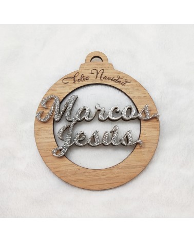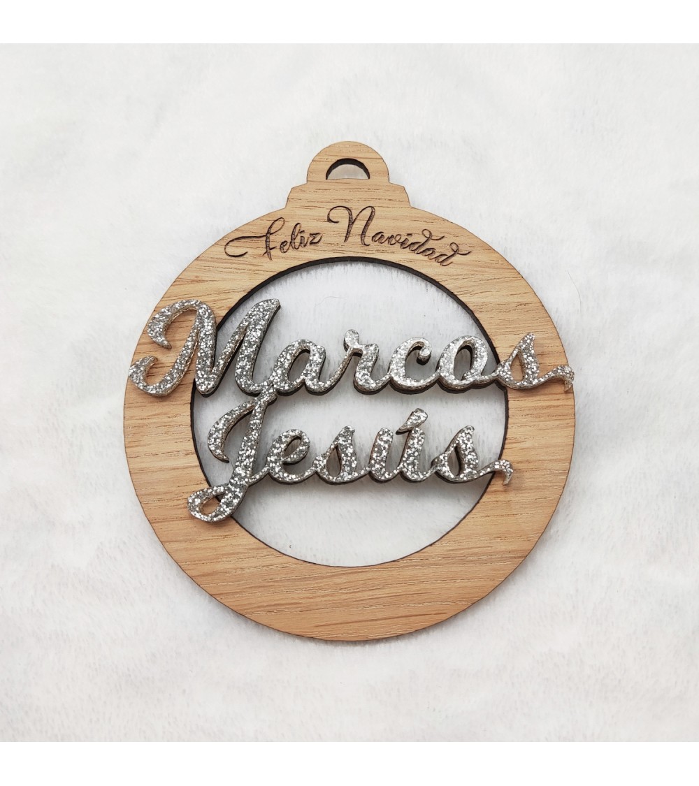 No olvide guardar su personalización para poder añadirla al carritoBola de Navidad diseño Roble-Glitter realizada en madera de roble y metacrilato glitter.