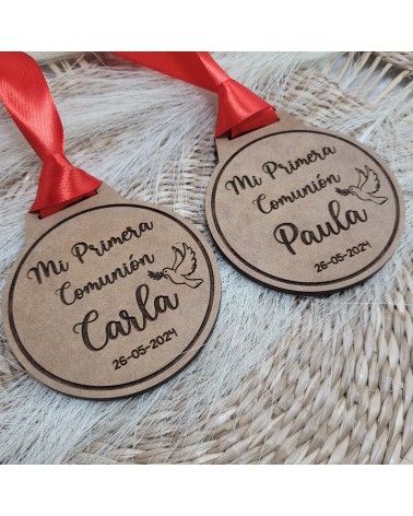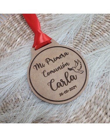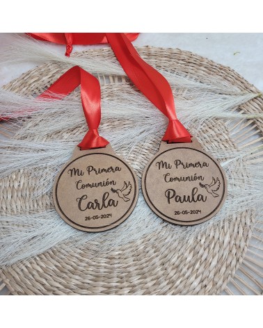 Celebra el Día Especial de la Primera Comunión con una medalla personalizada que será un recuerdo único para los niños. Hecha en madera DM de alta calidad, esta medalla está grabada con la frase "Mi Primera Comunión", el nombre del niño, la fecha del evento y una delicada paloma al lado, simbolizando la pureza y el espíritu de este día tan importante.
