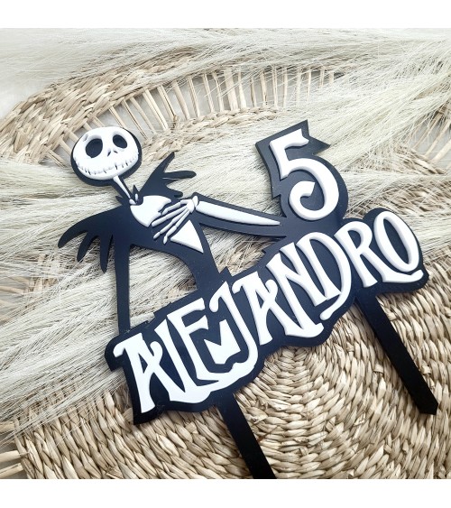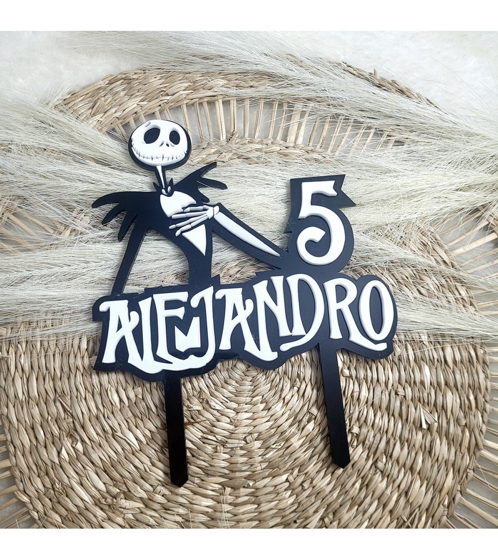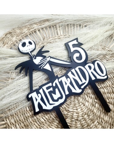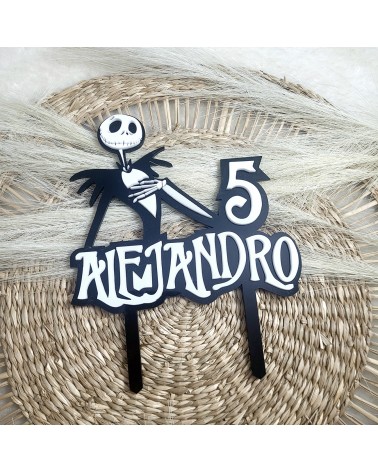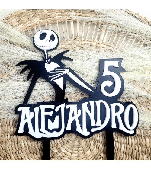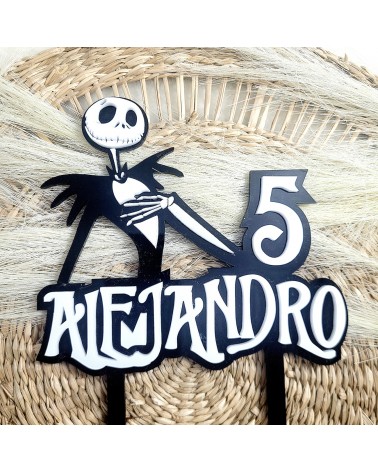 No olvide guardar su personalización para poder añadirla al carritoTopper de tarta con diseño de Jack pesadilla antes de navidad, realizado en dos capas de metacrilato de 3mm, metacrilato negro y blanco.