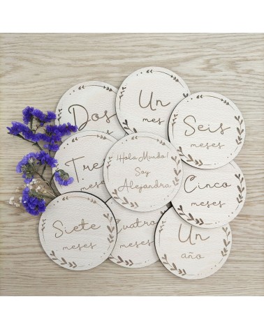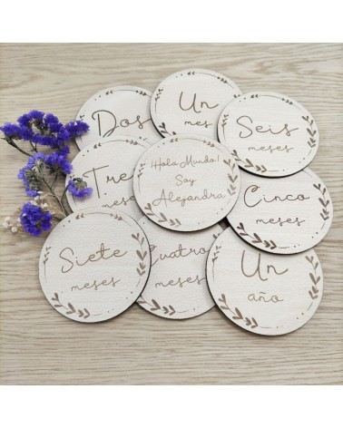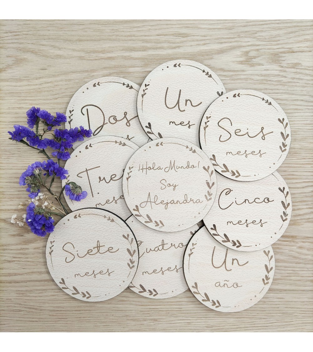 El pack consta de 14 placas (1 placa por cada mes del primer año, 1 placa de la primera semana y 1 placa de nacimiento con el nombre del bebé)