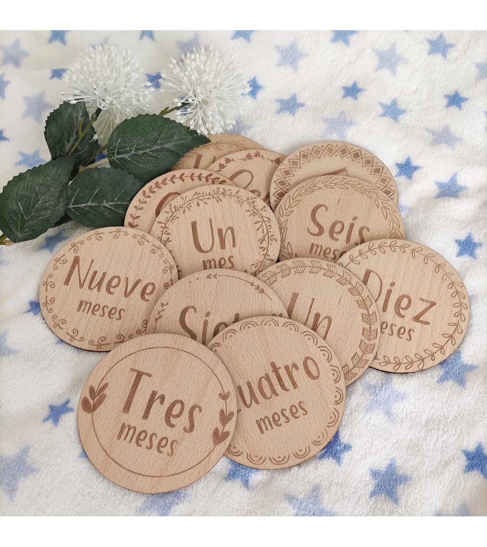 Estas plaquitas de madera de 10x10cm son el complemento perfecto para las fotos del primer año del bebé.