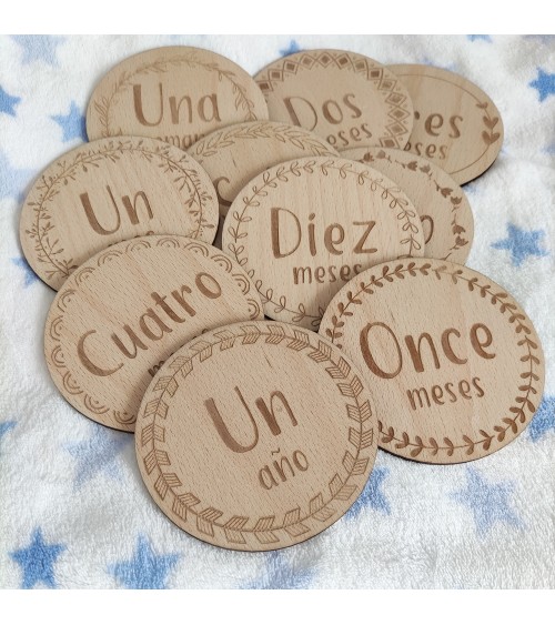 El pack consta de 14 placas (1 placa por cada mes del primer año, 1 placa de la primera semana y 1 placa de nacimiento con el nombre del bebé)