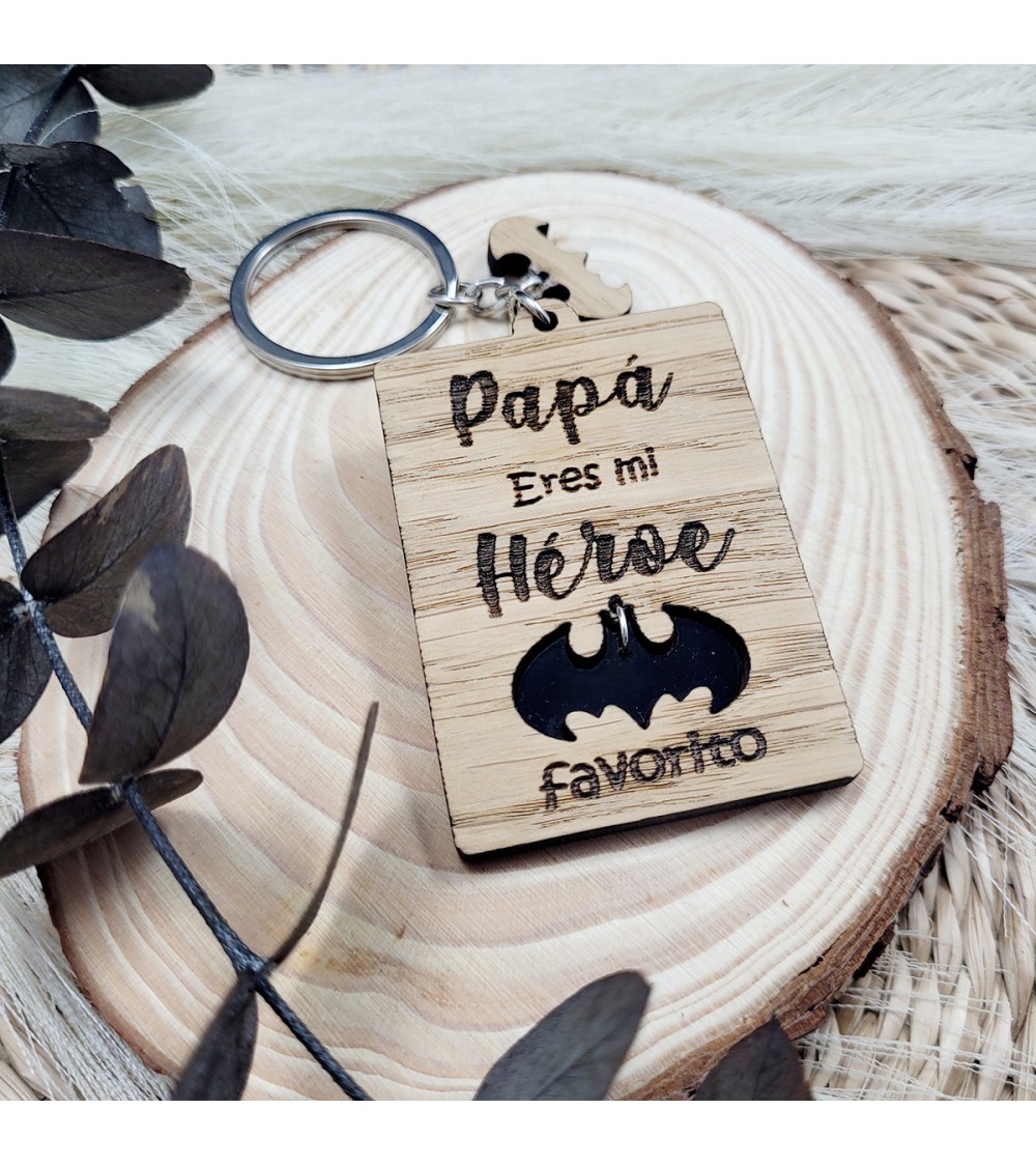 Llavero de madera rechapado en Roble grabado y con la silueta de Batman en silueta y elaborado uno a uno.