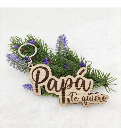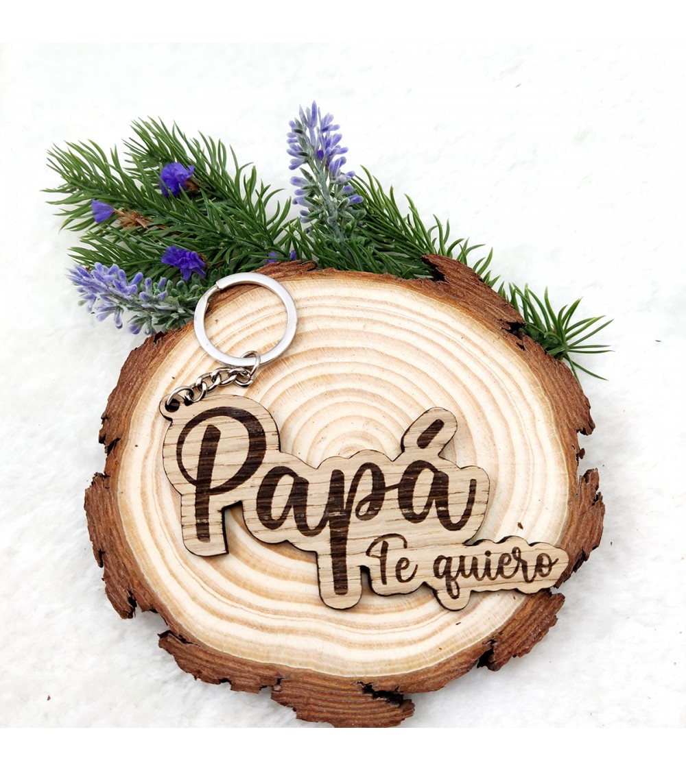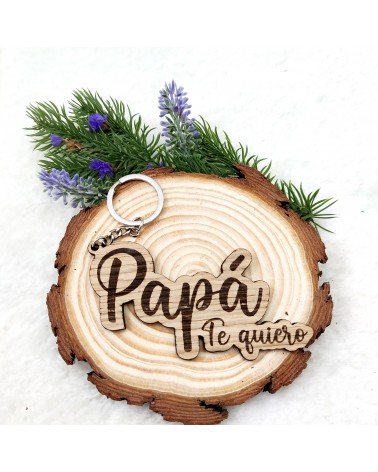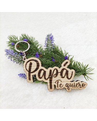 Llavero de madera rechapado en Roble con la palabra Papá grabado.