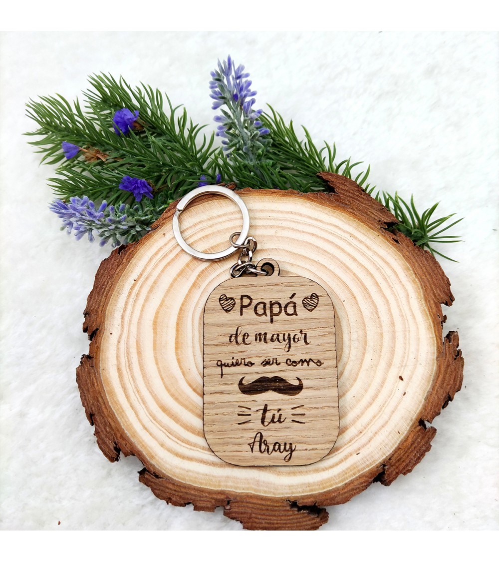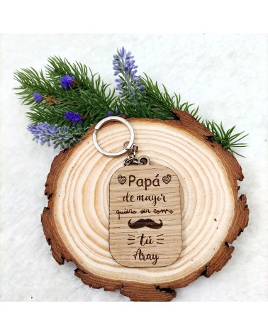 Llavero de madera rechapado en Roble, con la frase personalizada.