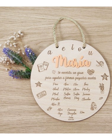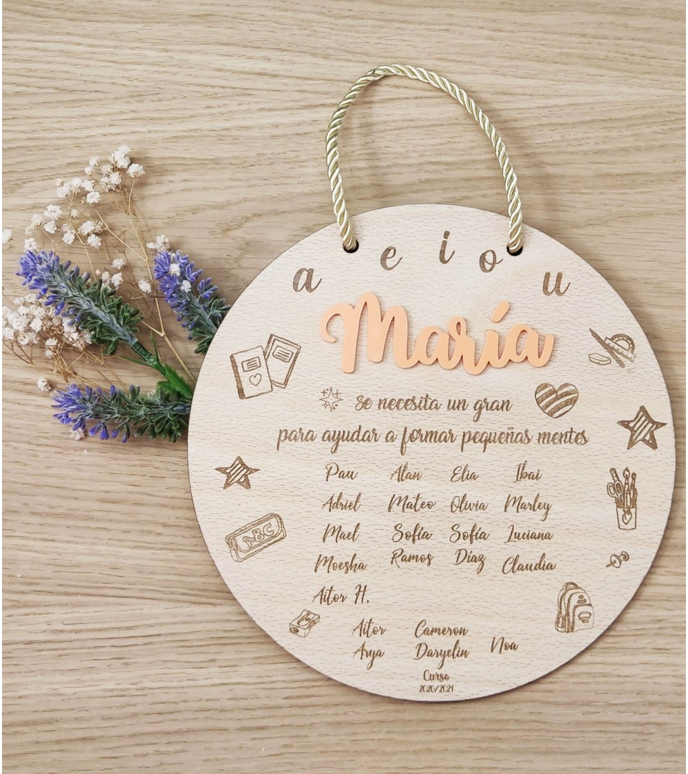 En la parte superior, las vocales cobran vida con un grabado único que añade un toque divertido y educativo. Justo debajo, el nombre del profesor en metacrilato se luce con elegancia, y en el centro, un mensaje personalizado que puedes elegir para mostrar tu agradecimiento. En la parte inferior, los nombres de todos los niños brillan grabados con cariño, rodeados de divertidos dibujos escolares como lápices, libros y estuche, ¡creando un diseño lleno de detalles que tu profesor nunca olvidará!