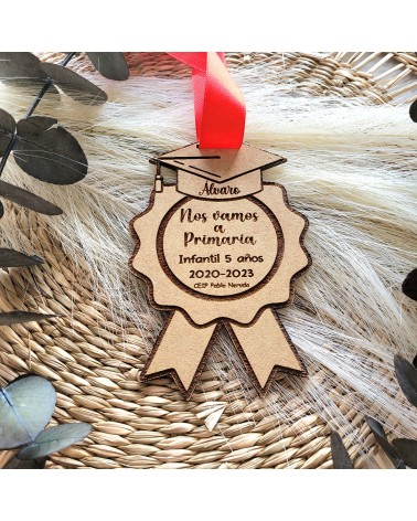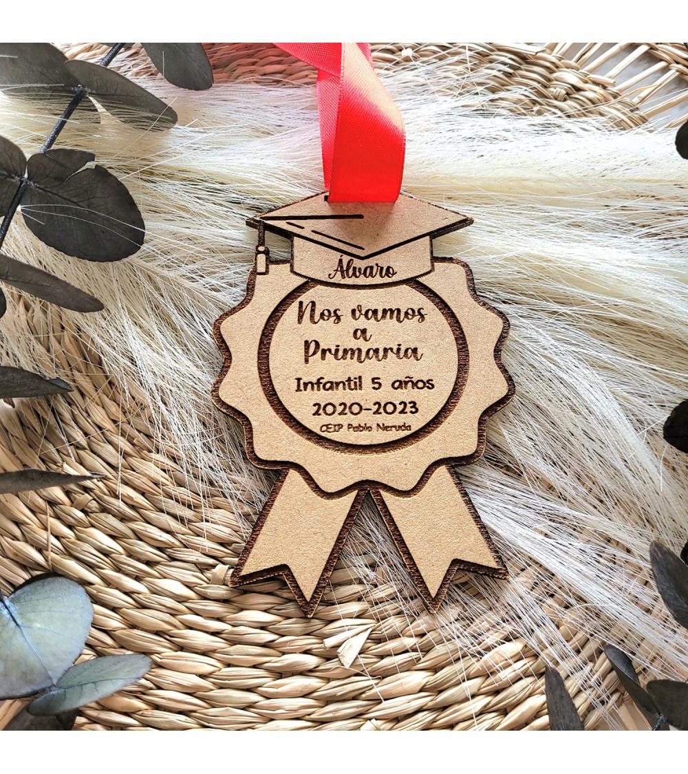 Celebra el logro académico con una medalla de fin de curso personalizada que hará que el día de la graduación sea aún más especial. Esta medalla, hecha en madera DM de alta calidad, tiene un elegante diseño con un gorro de graduación, y se personaliza con el nombre del niño, el texto y la promoción y el nombre del colegio.