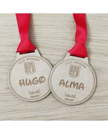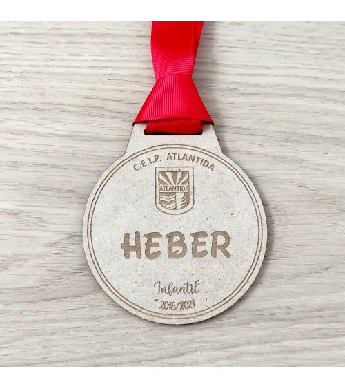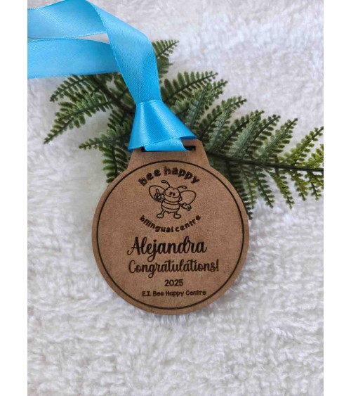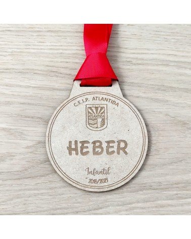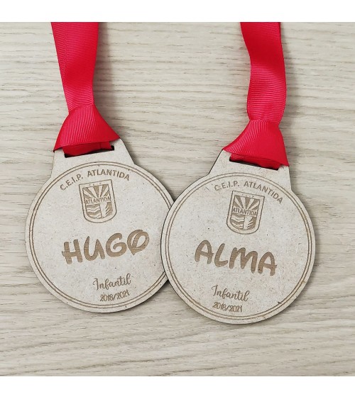 Cada medalla se personaliza con el nombre del niño y el escudo del colegio, creando un recuerdo especial para cada alumno. La madera DM proporciona una superficie duradera y elegante, ideal para que esta medalla se conserve como un símbolo del esfuerzo y el éxito.