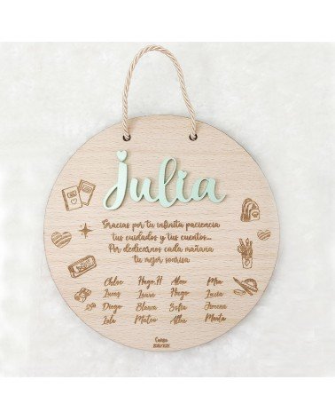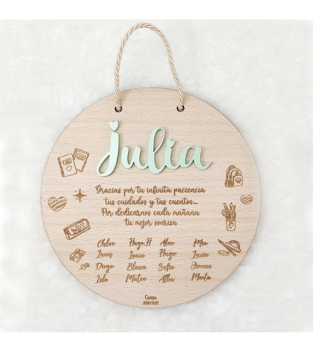 Dale las gracias a ese profesor o profesora especial con esta preciosa placa de madera de haya, diseñada para emocionar. En el centro, el nombre del profesor en metacrilato resalta con elegancia, mientras que tu mensaje personalizado grabado con láser hace que el regalo sea único e irrepetible.