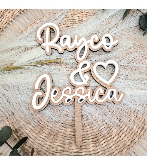 Topper de tarta realizado en madera y metacrilato con los nombres y un corazón precioso.
