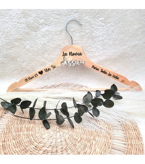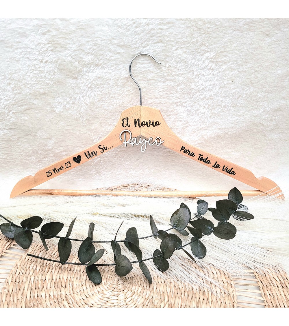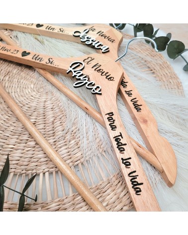 Personalizados con el nombre de los novios en relieve sobre la percha en color Blanco y con el grabado del texto en la propia percha.