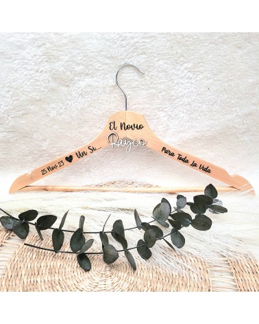 No olvide guardar su personalización para poder añadirla al carritoPack de perchas en madera en color natural personalizadas para novios.