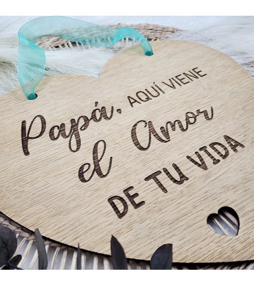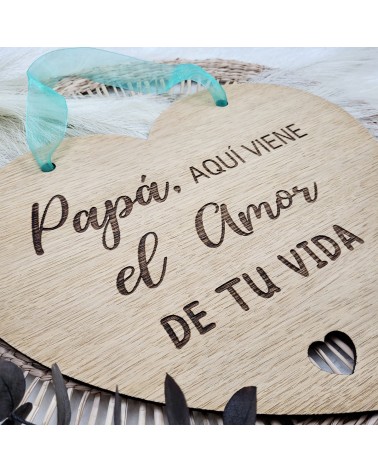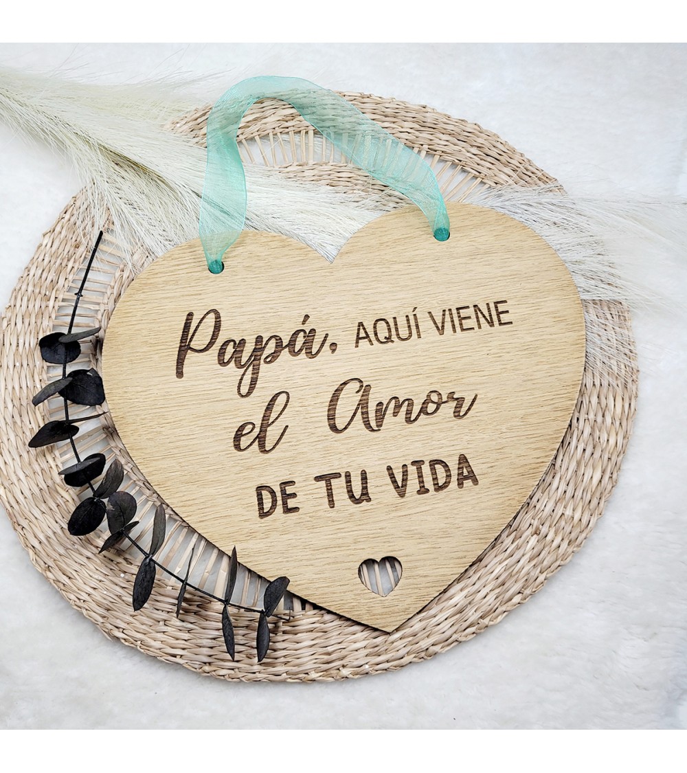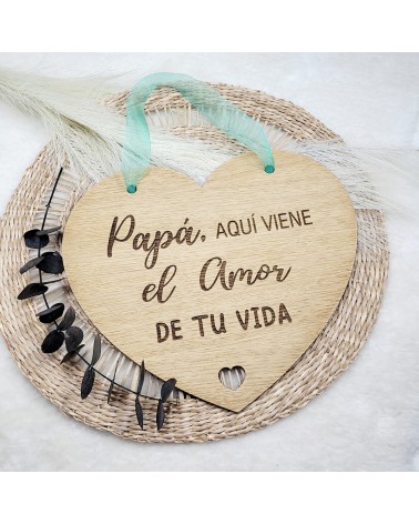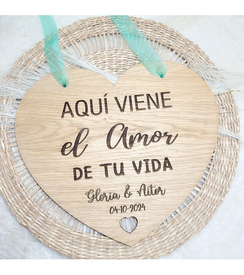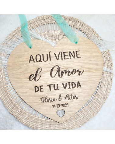 No olvide guardar su personalización para poder añadirla al carritoEste precioso cartel en forma de corazón es el detalle ideal para añadir un toque emotivo y tierno a la entrada de la novia. Realizado en madera de rechado de roble, es ligero, elegante y perfecto para que lo lleve colgado un niño, niña o familiar especial durante la ceremonia.