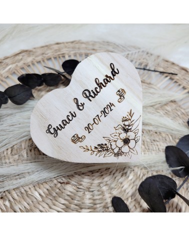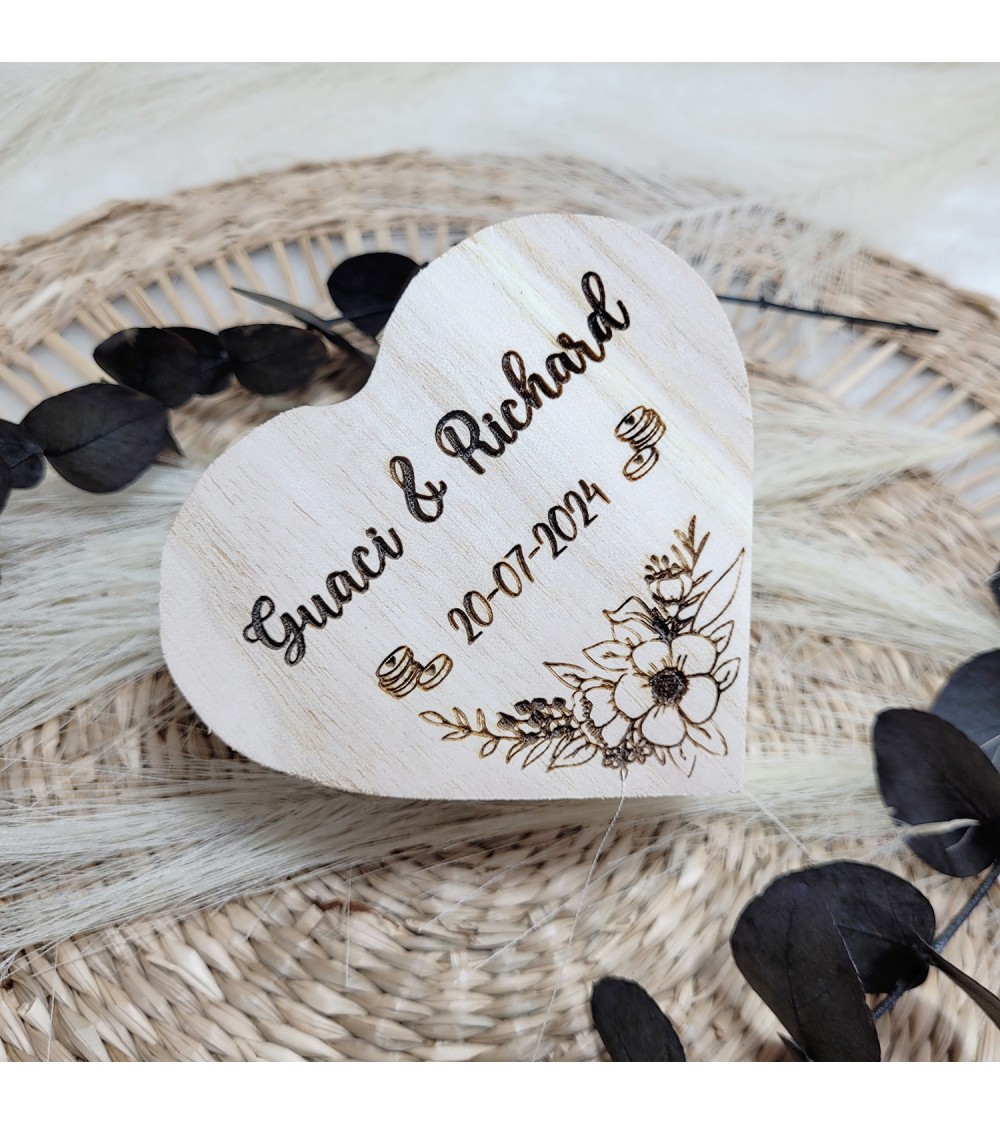 Caja de madera con forma de corazón, personalizarla con los nombres y fecha grabada sobre ella misma.