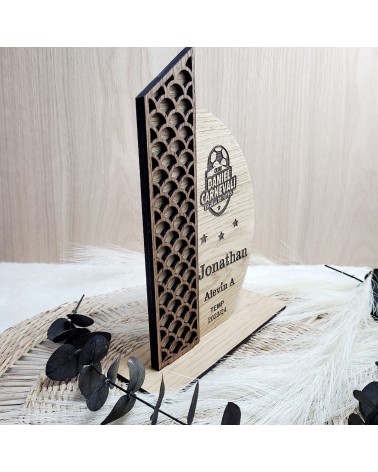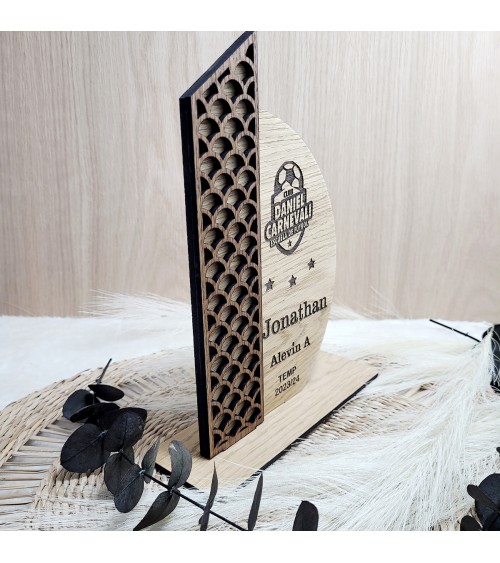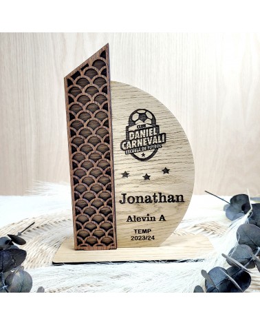 Diseñado con un elegante acabado en madera de rechapado roble, puede personalizarse con el nombre del entrenador, club, categoría y temporada. El grabado incluye también el escudo del equipo, convirtiéndolo en un homenaje único y lleno de valor simbólico.