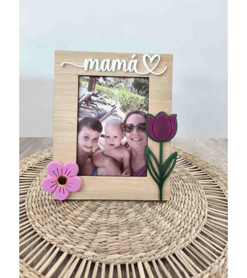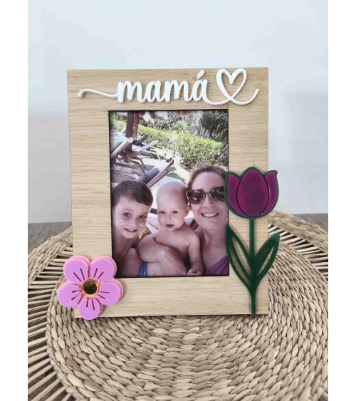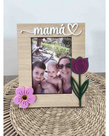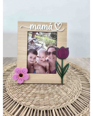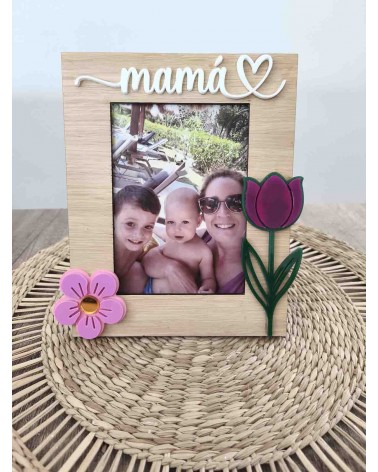 No olvide guardar su personalización para poder añadirla al carritoSorprende a esa persona tan especial con este portarretrato artesanal con la palabra "mamá", elaborado en madera rechapada en roble de alta calidad. Este marco de fotos combina el estilo natural de la madera con una decoración encantadora: un tulipán y flores en metacrilato de colores, que le dan un toque alegre, moderno y muy especial.
