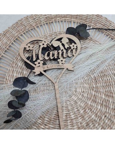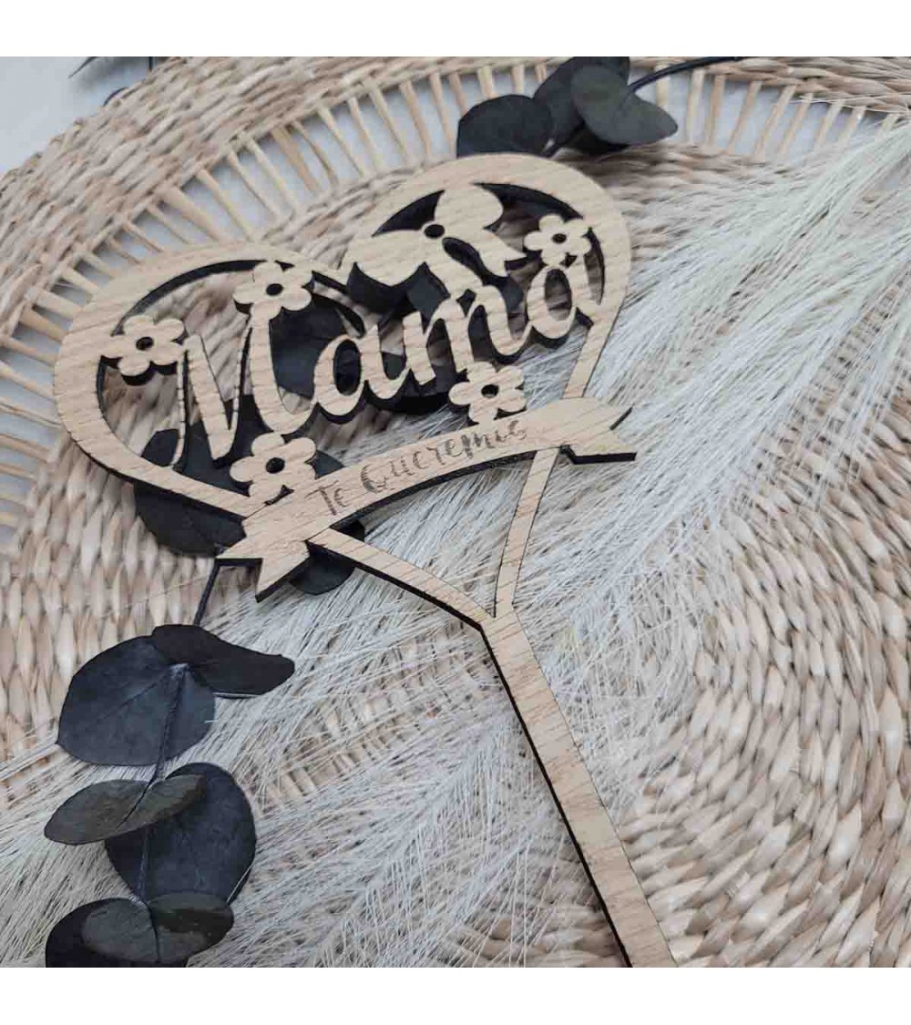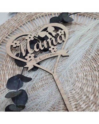 Haz que mamá se sienta única con este hermoso topper de madera en forma de corazón, con la palabra "Mamá" recortada en el interior, flores decorativas grabadas y un mensaje inferior que dice “Te queremos”, el cual puedes personalizar con el texto que tú elijas.