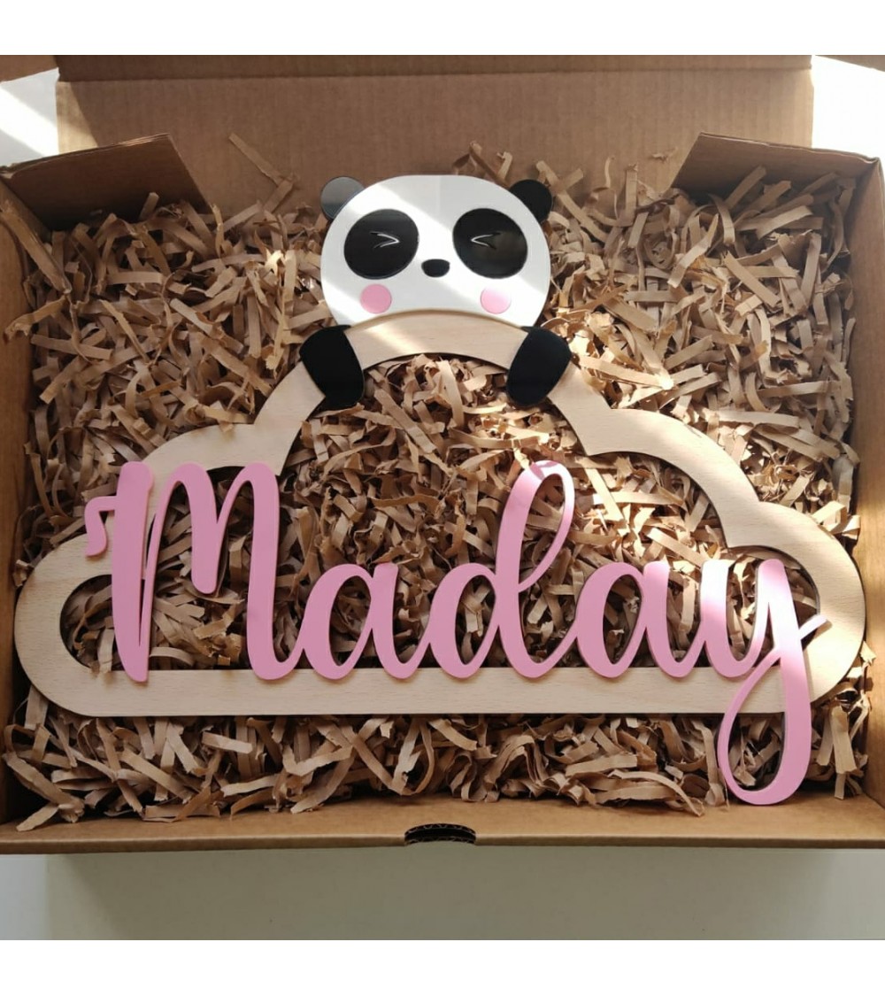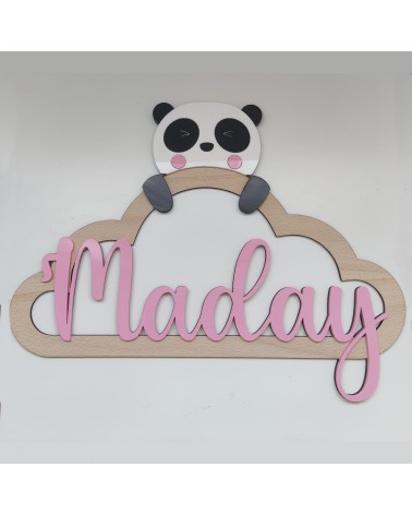 Nube realizada en madera de haya con nombre y oso panda en metacrilato.