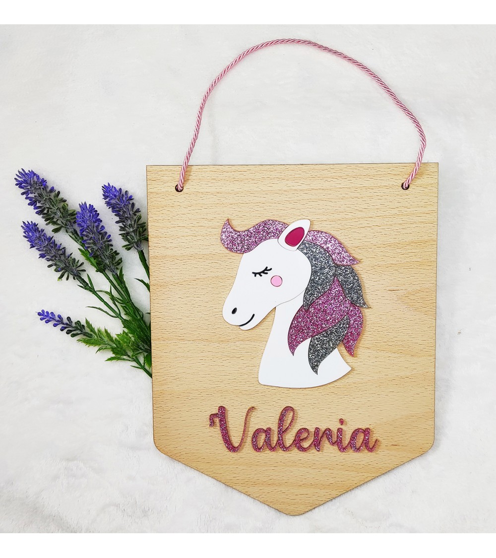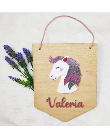 Placa decorativa infantil con nombre y diseño "caballo" en tonos brillante, realizado en madera de haya y metacrilato.