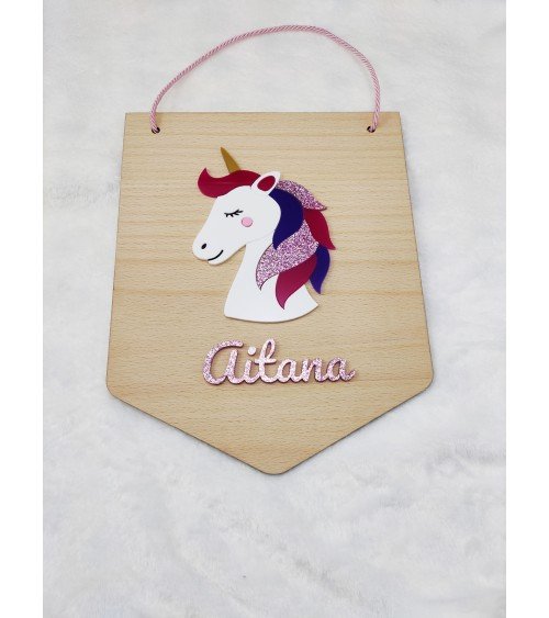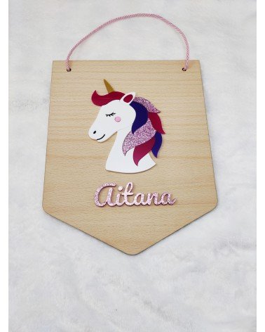 Placa decorativa infantil con nombre y diseño "caballo" en tonos brillante, realizado en madera de haya y metacrilato.