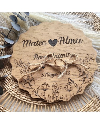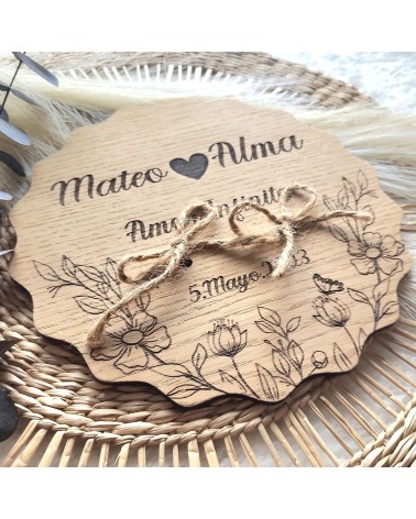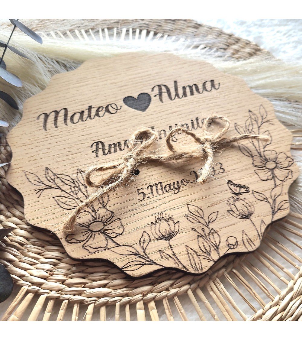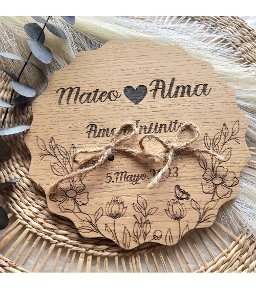 Porta alianzas de boda realizado sobre Madera de Roble con grabado personalizado.