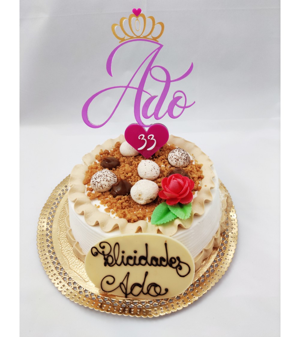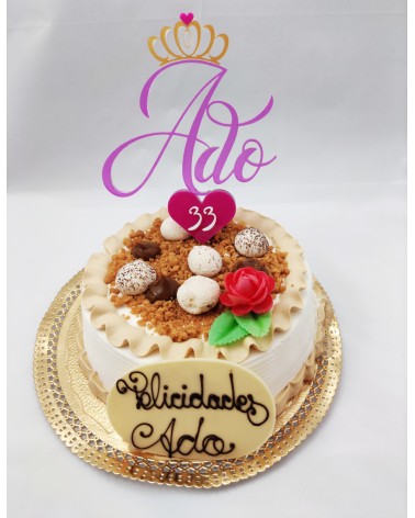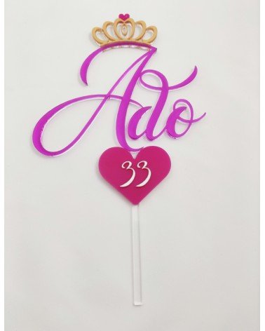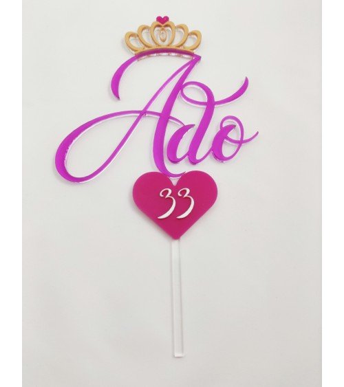 Topper con corona encima del nombre y con un corazón en la parte de abajo con el número.