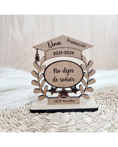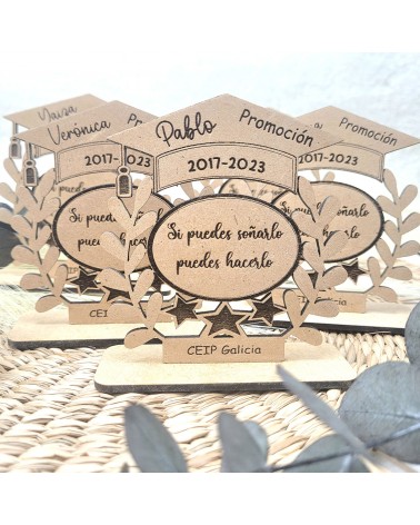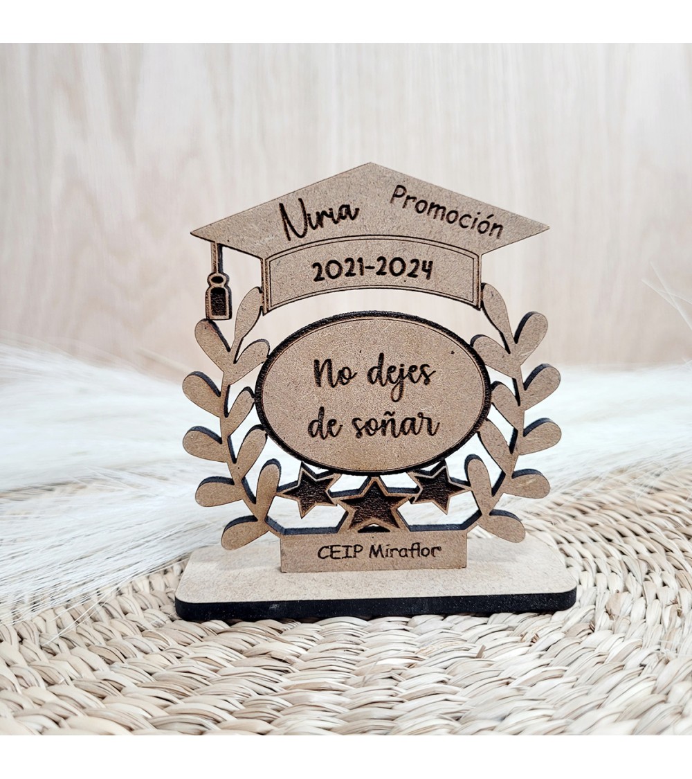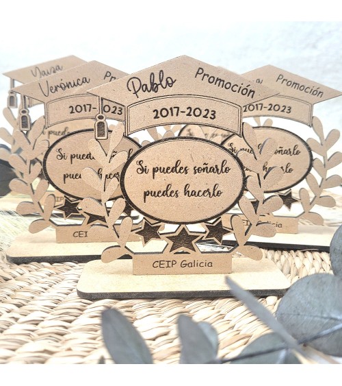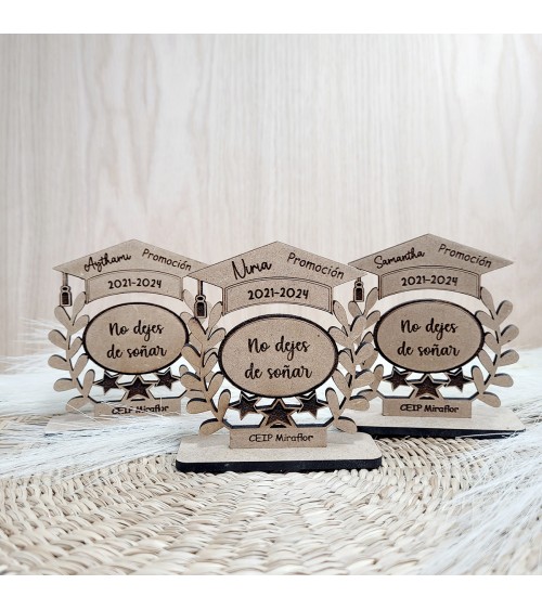 Ideal como recuerdo de graduación, fin de curso o celebración educativa, este trofeo está elaborado con mucho mimo en madera natural y grabado con láser de alta precisión. Un homenaje que emocionará a pequeños y grandes por igual.