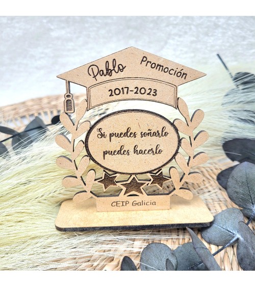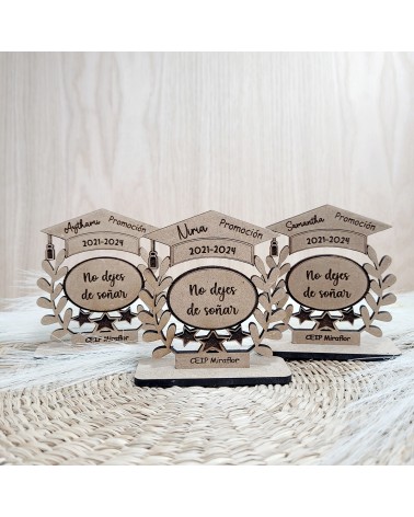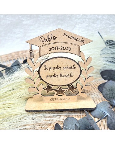 Este precioso trofeo de madera personalizado para niños es el detalle perfecto para premiar su esfuerzo, dedicación y crecimiento durante la etapa escolar. Con forma de birrete, ramas de laurel y una base estable, lleva grabado el nombre del niño, su promoción escolar y una frase motivadora que inspira: